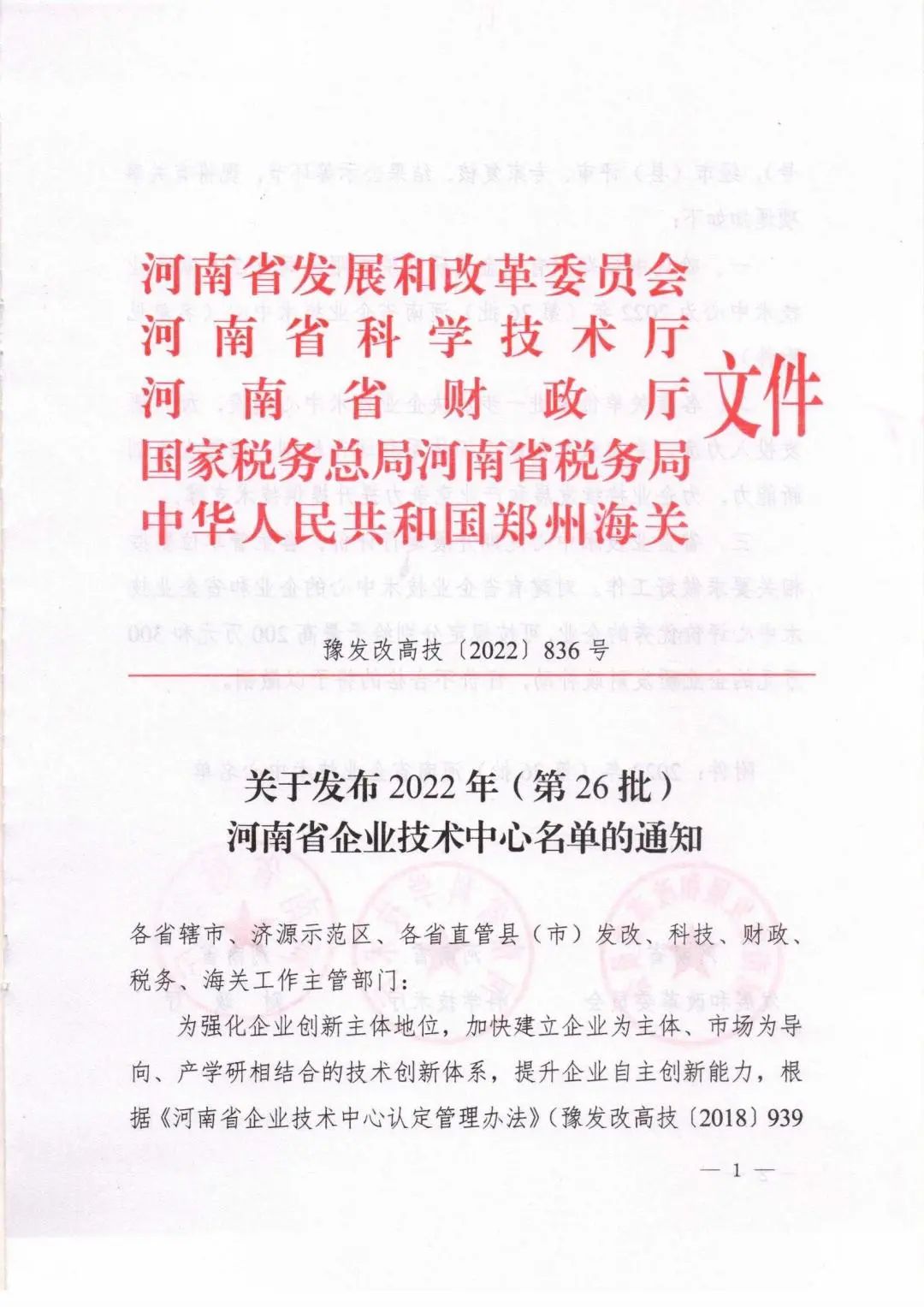 近日,河南省發(fā)改委、科技廳等五個權威部門聯合發(fā)文,公司企業技術中心獲批為 河南省企業技術中心,是繼2021年度獲批信陽市施工技術工程